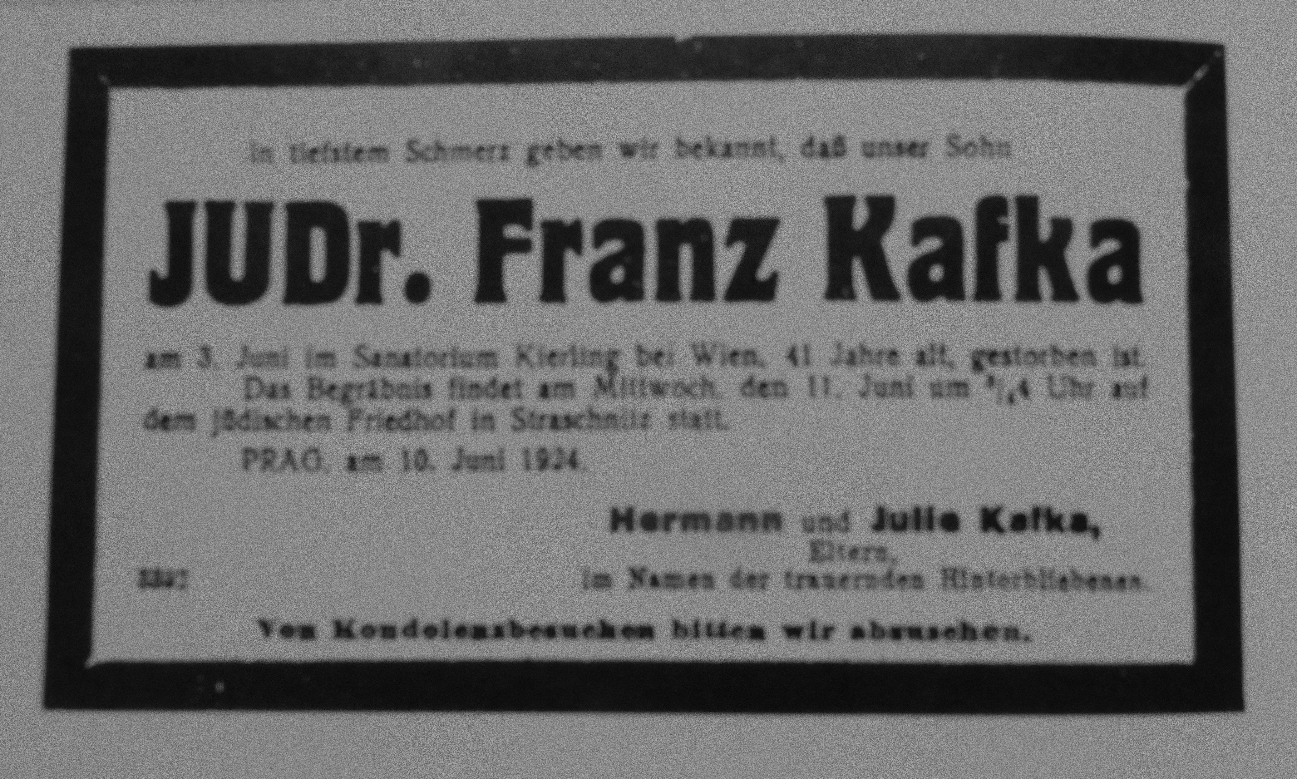 In deepest sorrow we announce that our son, Doctor of Law Franz Kafka died on June 3, at the age of 41, in the Kierling Sanatorium near Vienna. The burial will take place on Wednesday afternoon, June 11, at 3:45, at the Jewish Cemetery in Straschnitz.