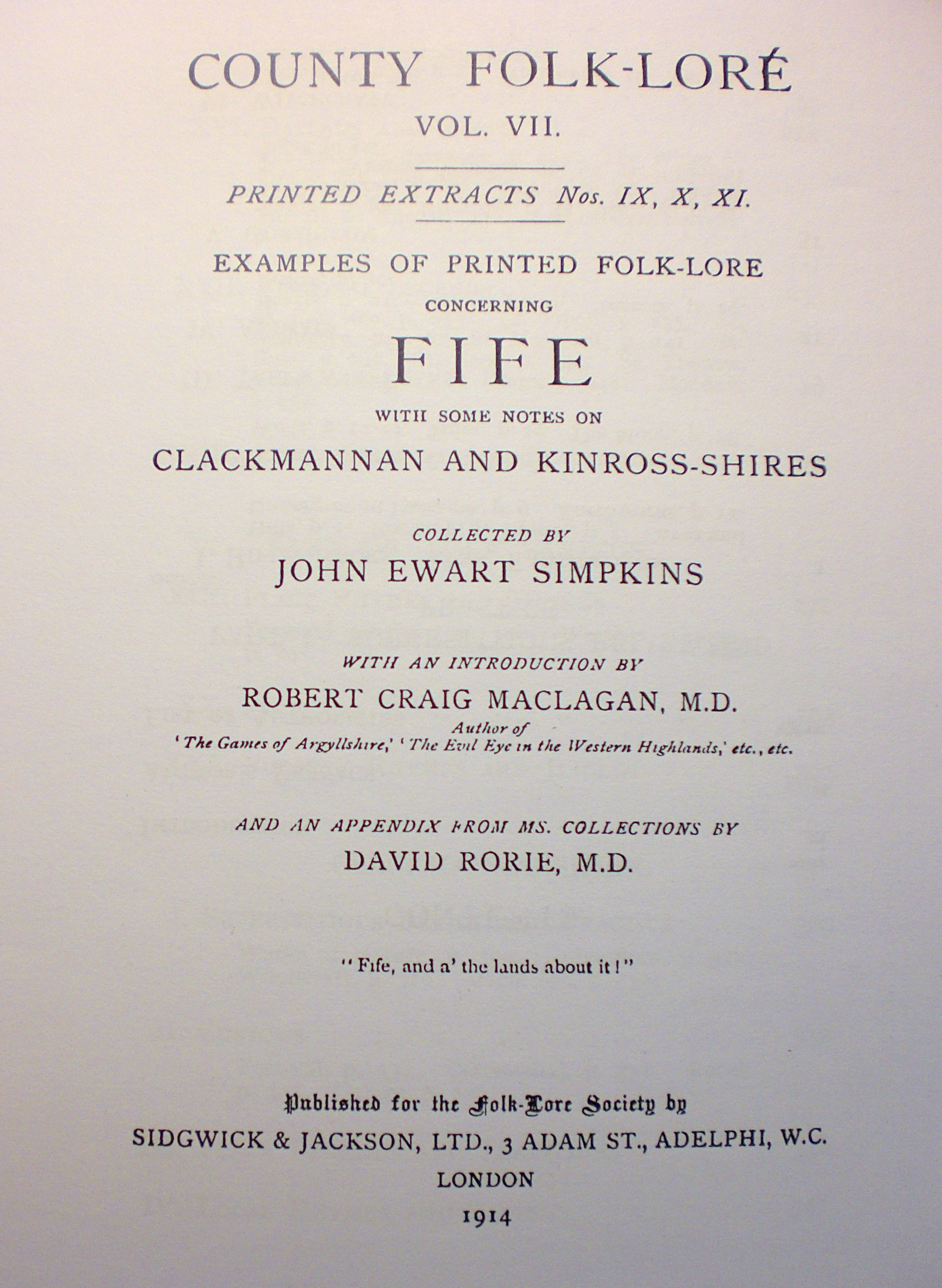 County Folk-Lore Vol VII. Examples of Printed Folk-Lore concerning Fife with some notes on Clackmannan and Kinross-Shires collected by John Ewart Simpkins (London: Sidgwick & Jackson for the Folk-Lore Society, 1914).