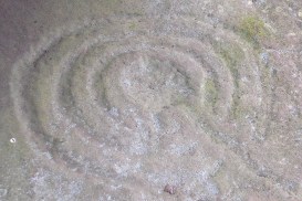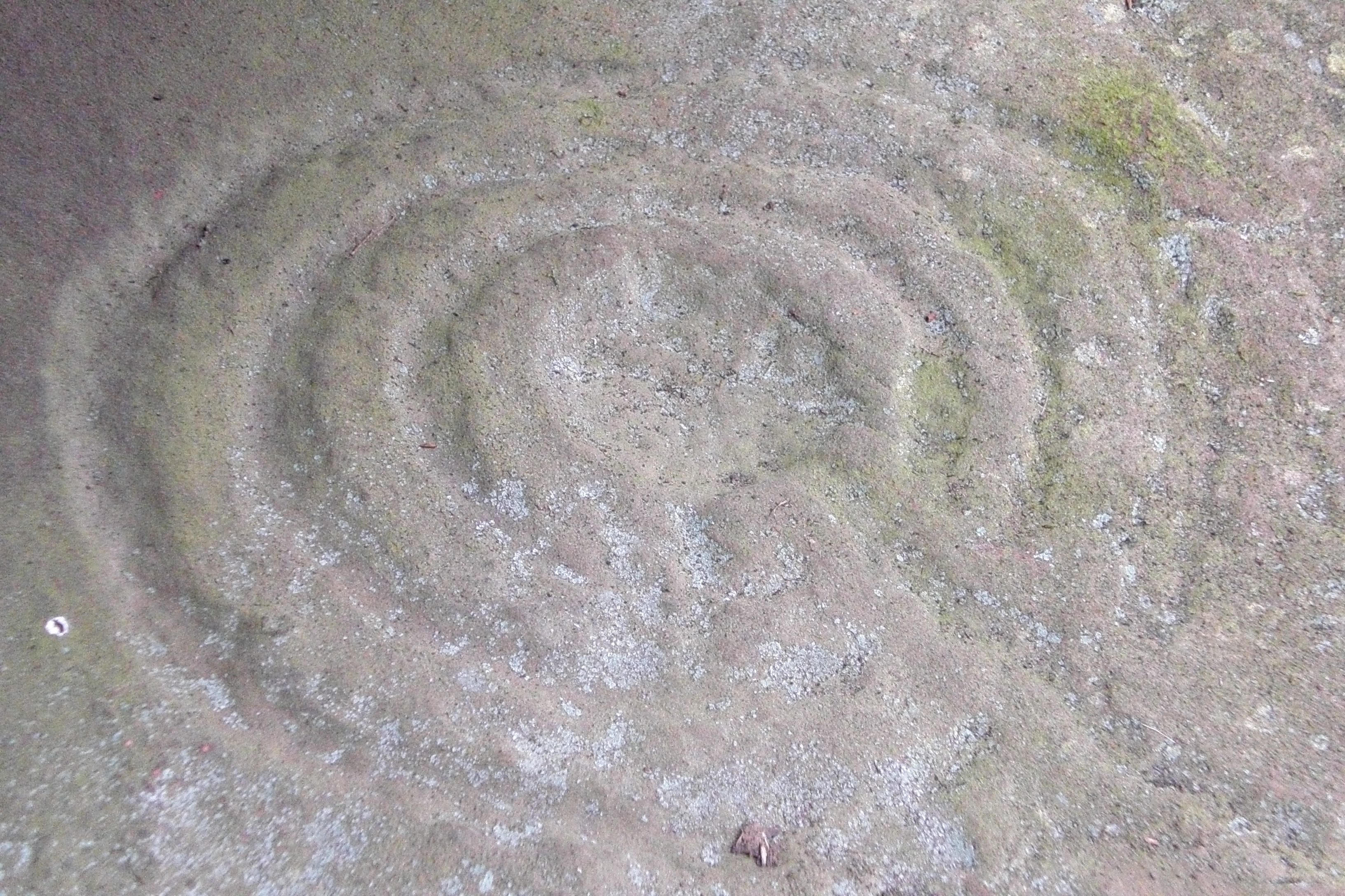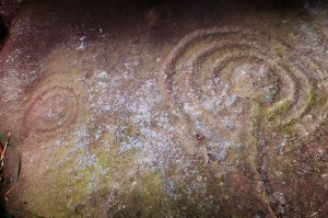 There are two key marks. One is a fully complete cup and ring, perfectly preserved. Another smaller one has been started but remains unfinished. I wonder why? It’s a blast to close your eyes and think that around 4,000 years ago someone had taken the time – many many hours – to carve these marks into this rock. This rock here – now! We can still only guess why and perhaps it is better that way. Do we want to know that it may have only been for some dull utilitarian purpose? No! Here it remains today something quite beautiful and powerful, expressive human poetry. Materially tangible but elusive and meaning slips away, like grains of sand through the fingers, if we try to wring out its mystery in theories and guesswork.
