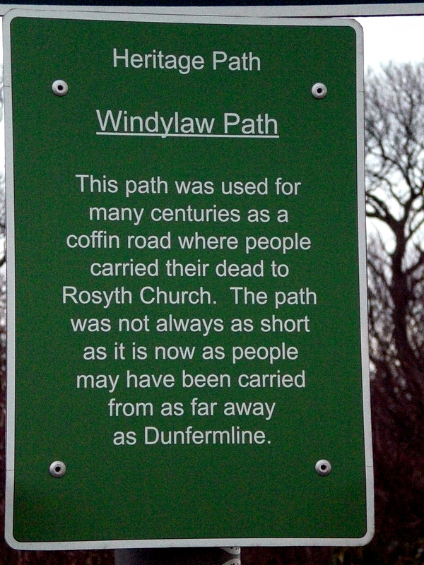 We approach the village from the North by the coffin road known as Windylaw. A sign indicates that this path was used for many centuries by people to carry their dead to Rosyth Church. Sometimes they would come from as far away as Dunfermline.