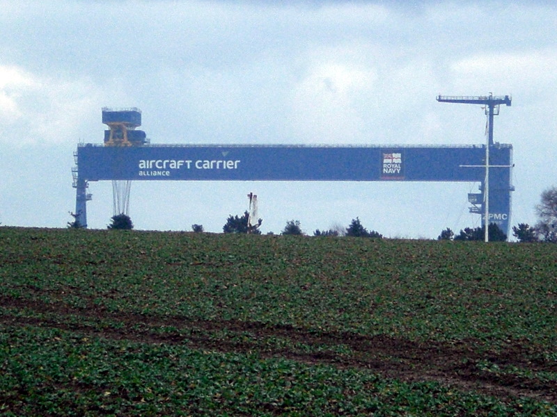 “Goliath is the largest crane installed in the UK and part of the most expensive project in British naval history with two aircraft carriers presently being constructed at £3 billion a pop. We have already been told that once constructed, one will be mothballed immediately and the other will have no planes to fly from it. Try explaining this logic to a five year old. The carriers are to be named HMS Queen Elizabeth and HMS Prince of Wales. The sheer folly, financial carnage and symbolism of this whole escapade is such that it almost fries our collective brain into meltdown. However, very soon we are all whistling and singing Elvis Costello’s Shipbuilding – the Robert Wyatt version naturally – so we can hum the piano solo with our kazoos. This has the desired effect, tames the beast and calm descends. As we walk further along the road, we can gain a better vantage point to look down