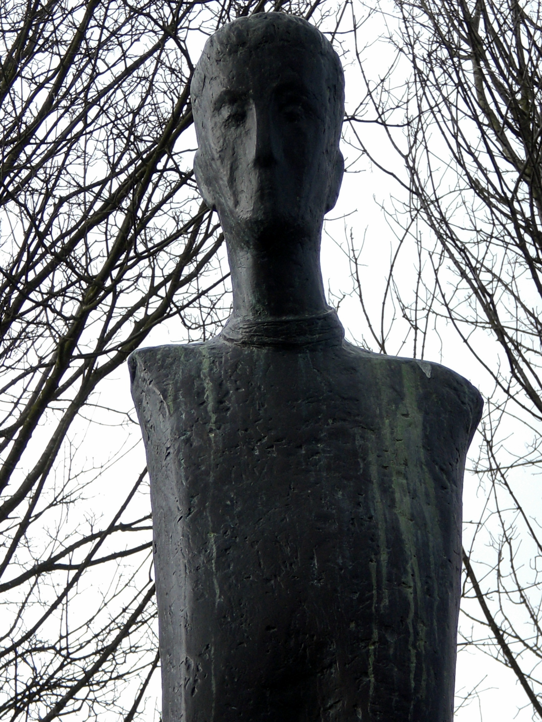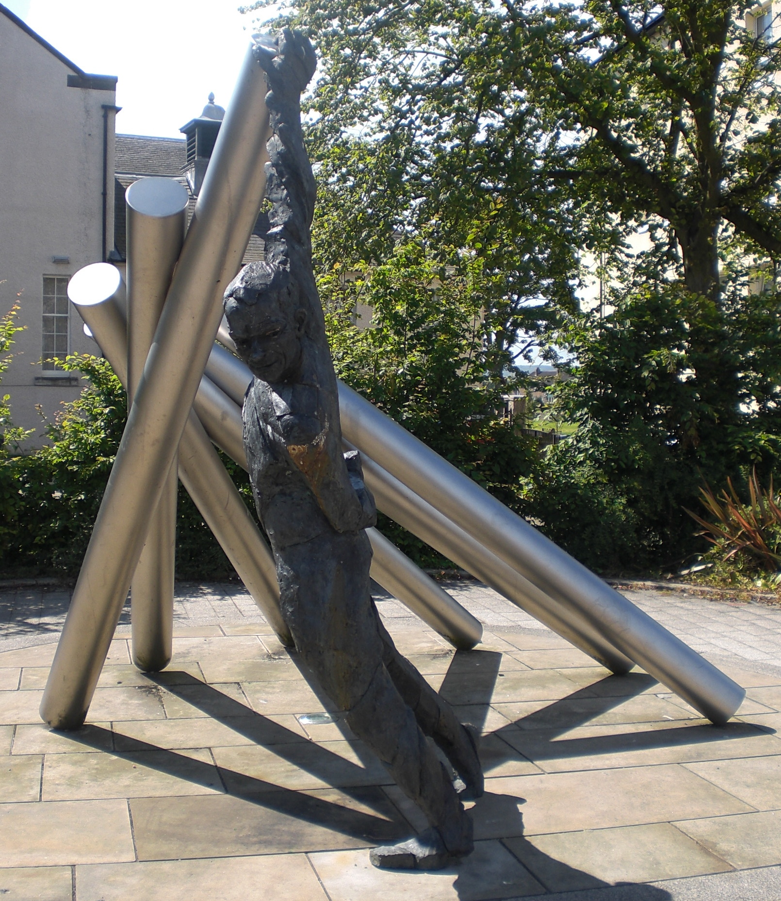 The Prop portrays a lone miner propping up, or holding on, to six stainless steel forms, representing pit props? A reminder of the town’s mining heritage but an addition to a new sense of place in its own right. This is not monumental art. It quietly invites you to spend time with it. Walk around the space to catch the light fracturing off of the shining stainless forms and it’s then you notice that each column has a line of poetry engraved in to it. We subsequently learn that the poem God is a Miner is by local poet William Hershaw.