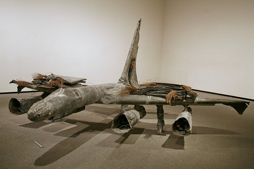 The miner looks as if he has just emerged from a coal seam, rough-hewn from deep time. Absorbing light into solid form in contrast to the sleek, reflective stainless steel.