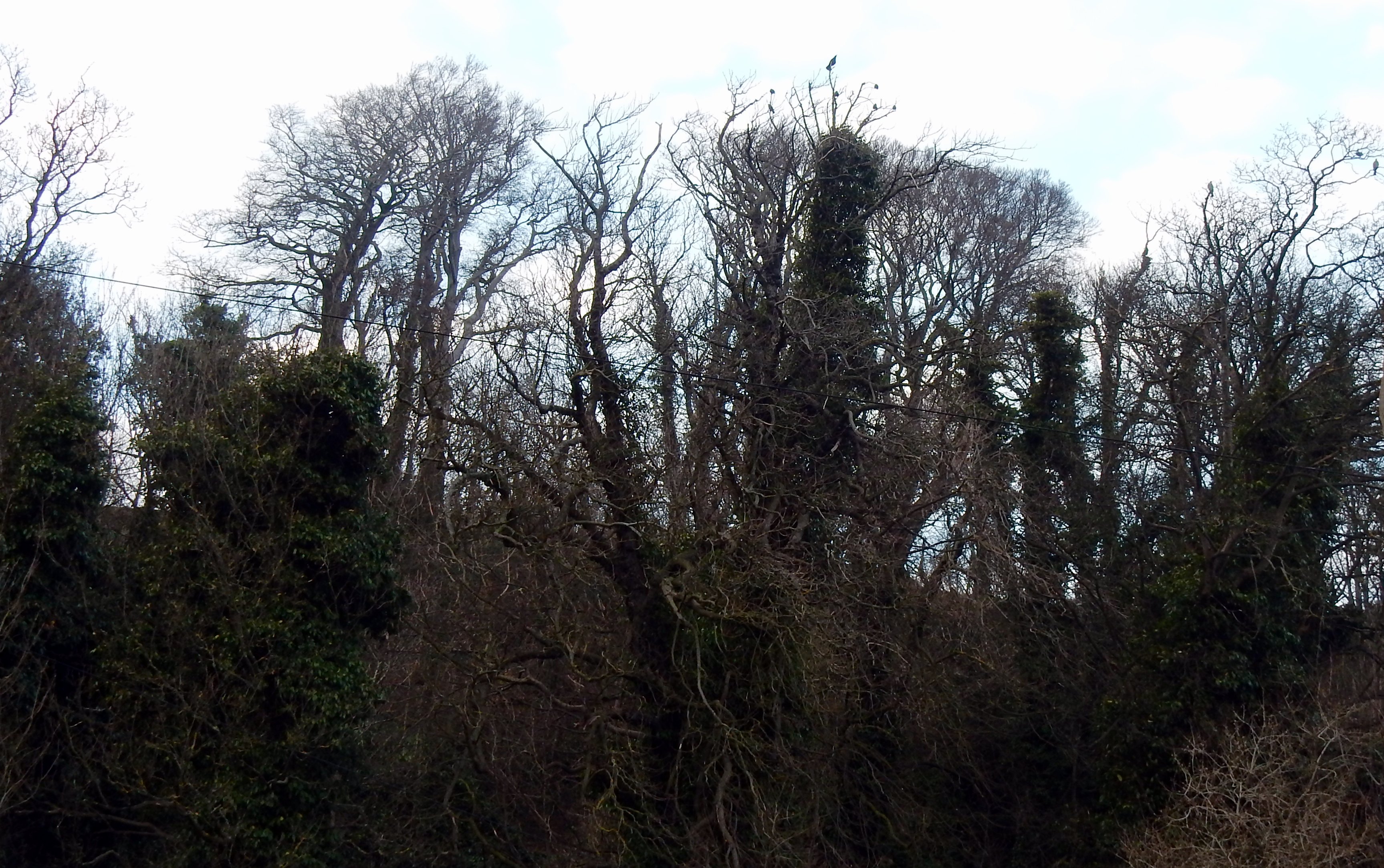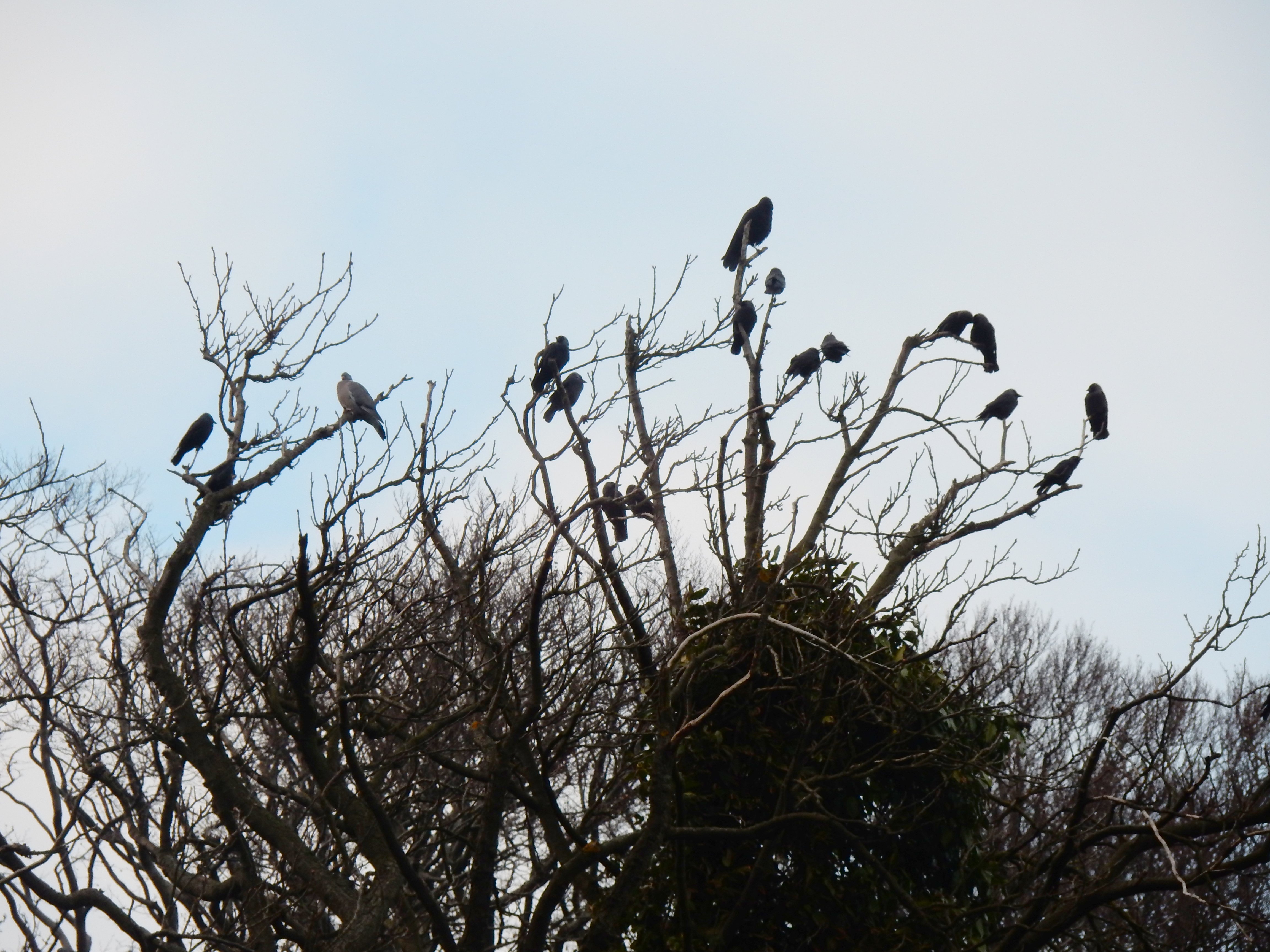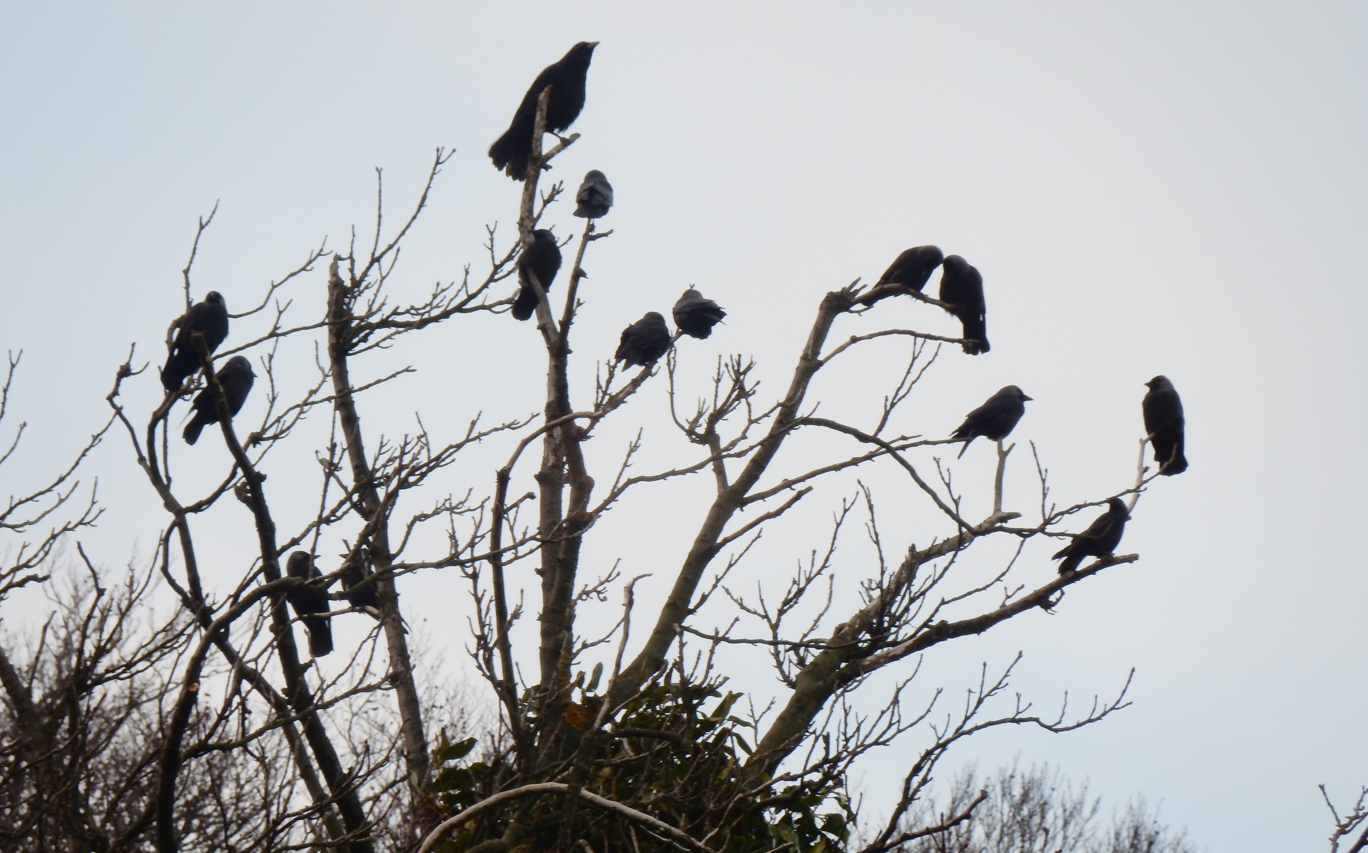 For no apparent reason, they suddenly take flight. A spiralling vortex of wing, beak and claw, ascending, then wind-blown towards the white crosses in Douglas Bank Cemetery. Only four return to the upper branches, no longer interested in us. One looks west whilst three gaze towards the east indicating our direction of travel.