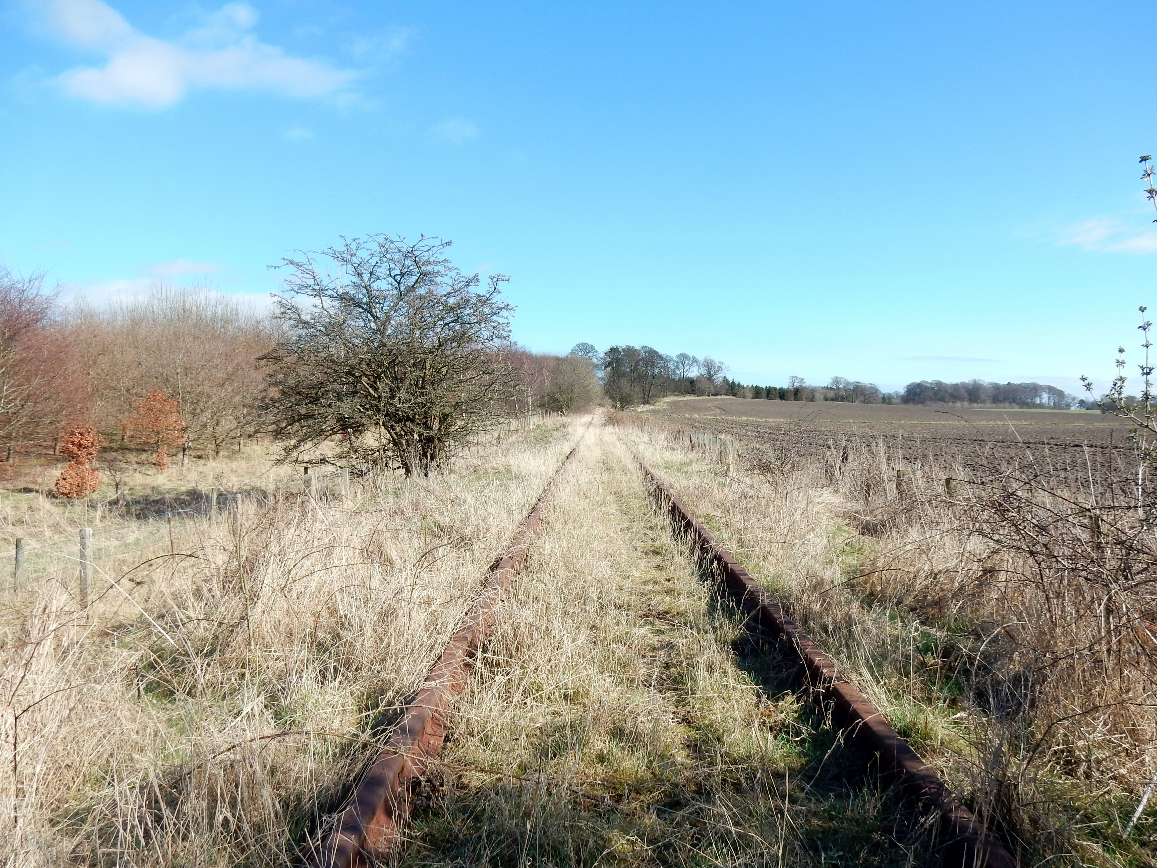 But this is no isolated rural idyll. To the north, the line runs parallel to the A985, one of the busiest trunk roads in Scotland and the white-noise throb of passing traffic is our soundtrack for a mile or so. To the south, the views are over agricultural land, recently ploughed. In the foreground a suggestion of trees: