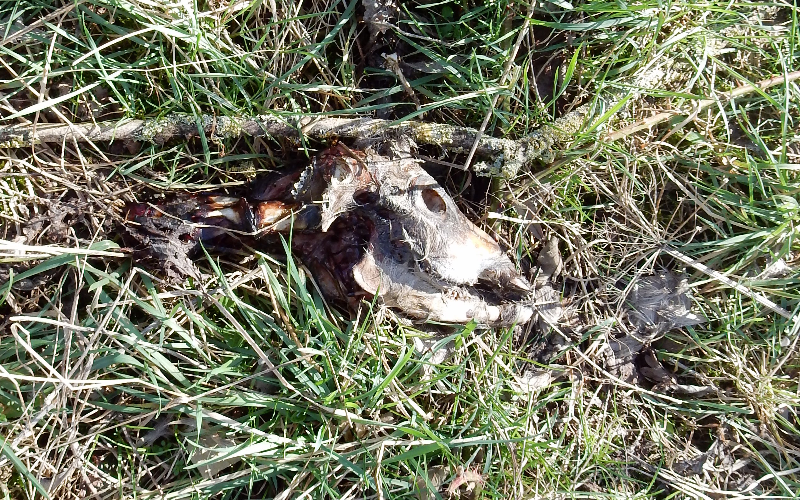 Detached and slightly further away lies the white skull, stripped and pecked clean. The downy feather bed suggests that some of the birds who came to feast on the carcass ended up being part of someone else’s meal.