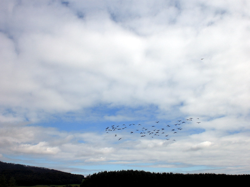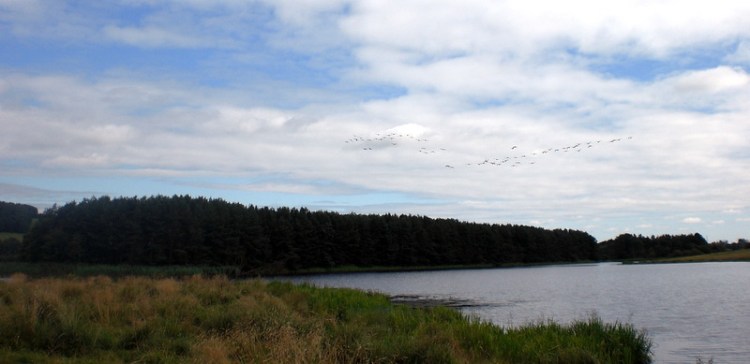 It seemed barely credible that this was the first weekend in October as we headed in a vague direction towards the contours of the limbo landscape. First, a short detour to Loch Fitty, looking serene, underneath brilliant blue skies punctuated by billowing clouds scudding overhead. A solitary duck on the water placed like a calligraphy mark on a sheet of blue marbled paper.