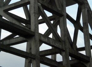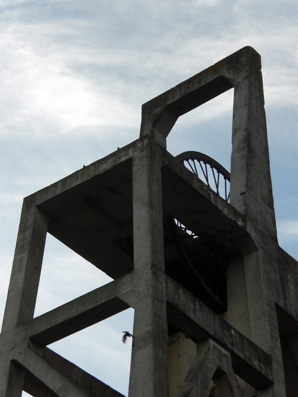 An avenue of coal machinery parts has been placed on top of the structure. Transformed from utilitarian metal and concrete into slowly changing collection of weathered patinas across the colour spectrum: